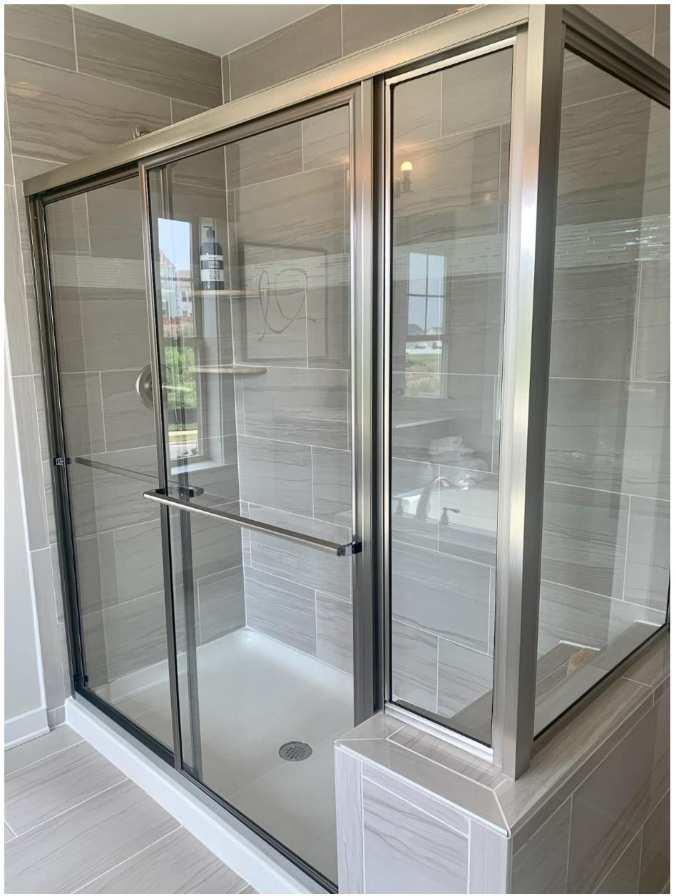 Frameless shower doors size will vary depending on house type and structural bathroom configuration. Hinges and handles will match selected finishing package. Only available to upgrade in the owner’s bathroom.